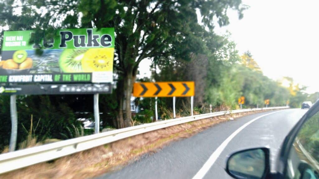 From Opotiki, the drive continues along the Bay of Plenty, named by Captain James Cook for its abundant resources. The road straightens out, and the landscape shifts to fertile plains and orchards. And the funnily named kiwifruit capital of the world.